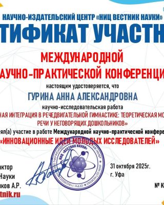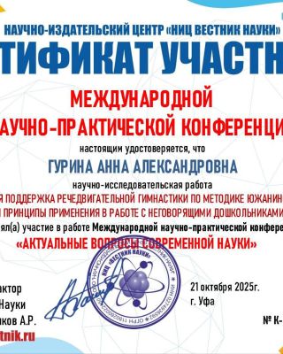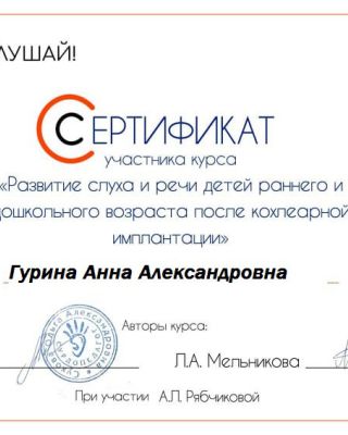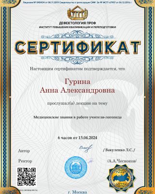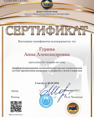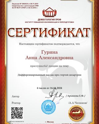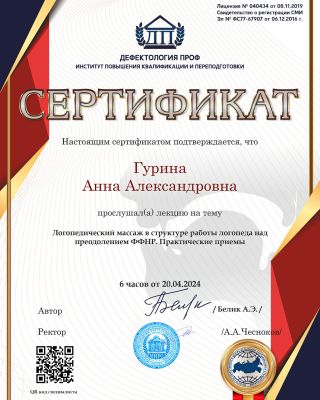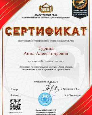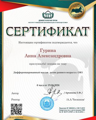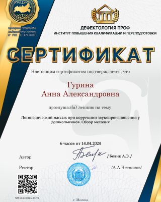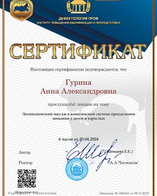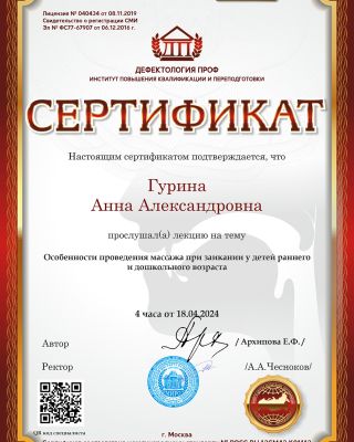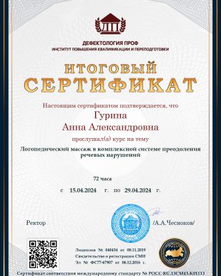 - Повышение квалификации — прошла курс: «Логопедический массаж в структуре логопедического занятия». Регулярно получаю новые знания. Потому что в нашей профессии нельзя остановиться и решить, что ты уже всё знаешь.